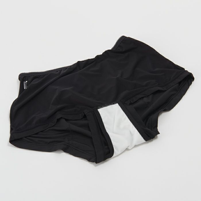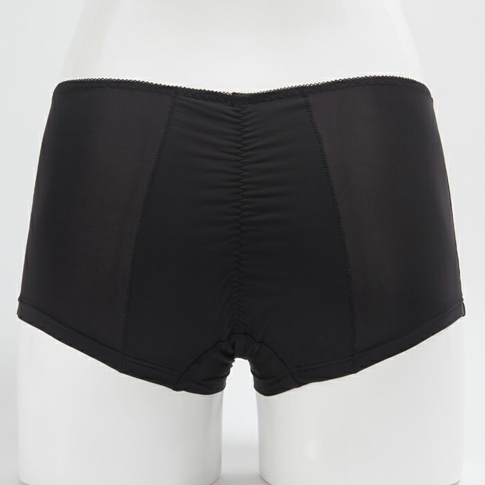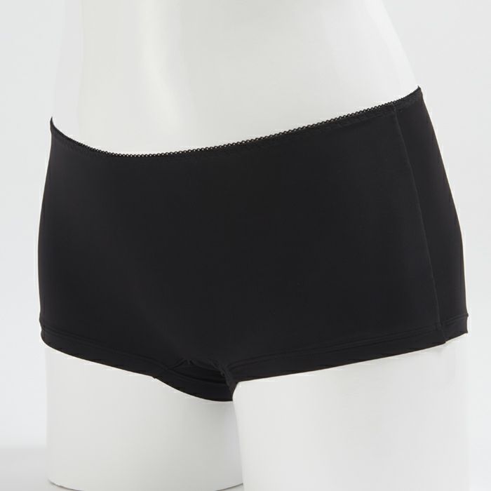 生理の不快感を軽減するサニタリーショーツ しっかりフィットして安心感抜群のサニタリーショーツ。 シンプルな無地ブラックは汚れを目立たせず、デイリーからナイト用まで活用できます。 バックまで防水布でカバーして、ロングナプキンにも対応。モレをしっかり防ぎます。 マチ部分はナプキンの羽根をしまえる設計。後身の立体ギャザーでヒップを包みこみ、ズレずにぴったりフィットします。 伸縮性が高くゴワつかない素材で、不快なムレを軽減します。 ボーイズレングスタイプなので締め付けが少なく、脚の付け根の痛みや痒みも解消します。 足口は肌当たりが優しい折り返し仕様です。