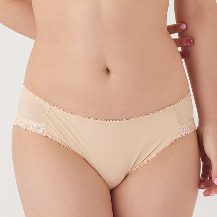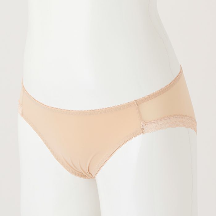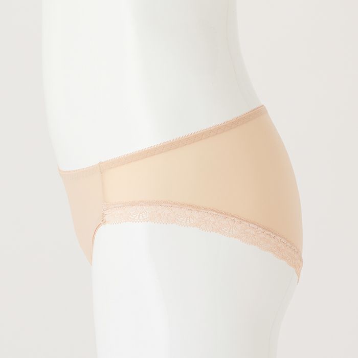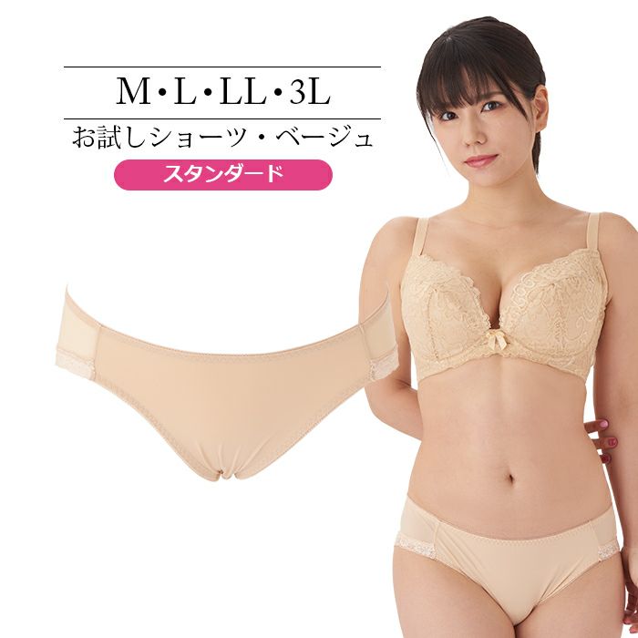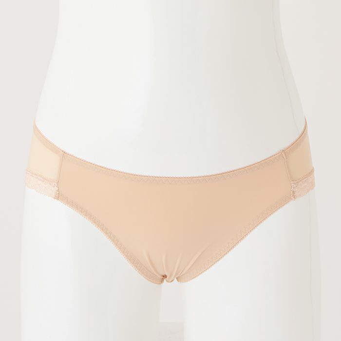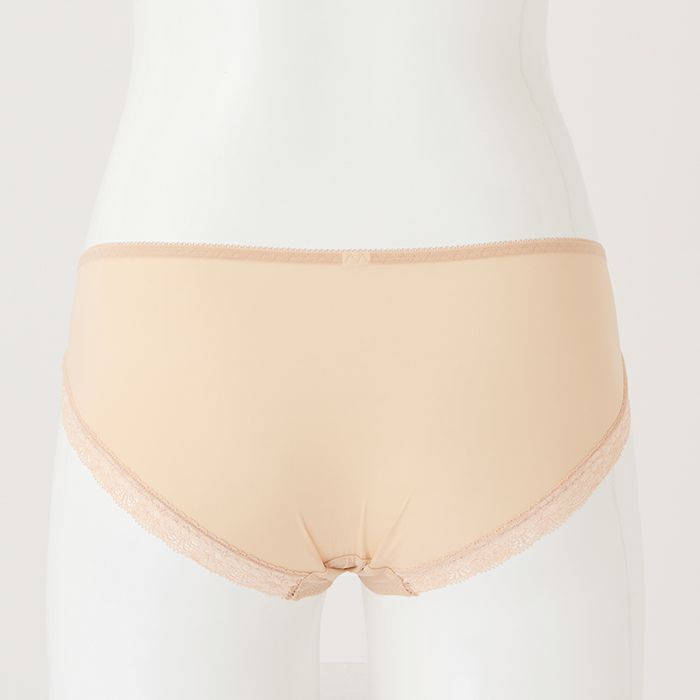 お試しブラVer2.5とお揃いのカラー 定番のノーマルショーツ。 伸縮性の高い素材で履きやすく、シンプルな無地ベージュなので普段使いに便利です。 アウターに響きにくいように後足口には細幅レースを使用しています。