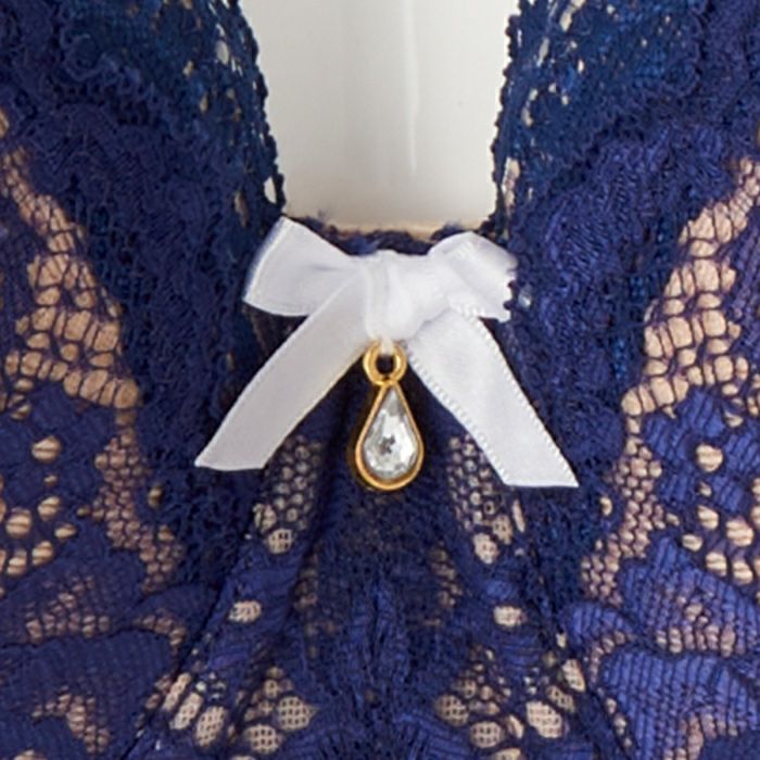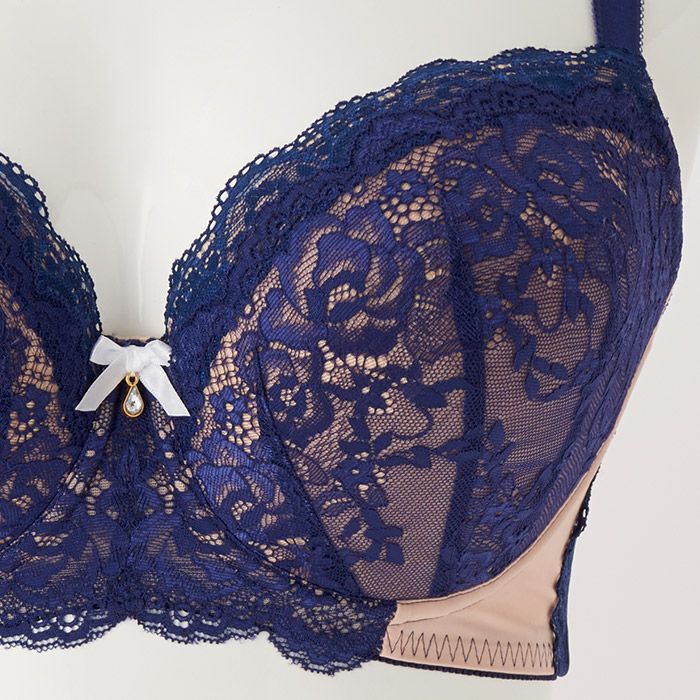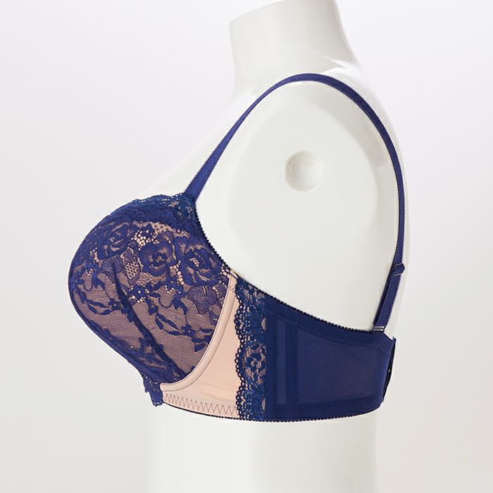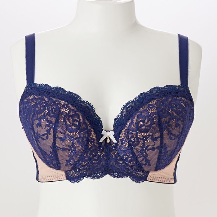 ベージュカラーにネイビーのレースを合わせたクラシカルな印象のランジェリー。 カップとフロントにはストレッチレースを重ね、カップ上辺とサイドには細幅レースをあしらいました。