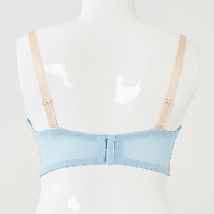 ベビーブルーとホワイトの清楚な色合いにゴールドのきらめきをプラスしたランジェリー。
