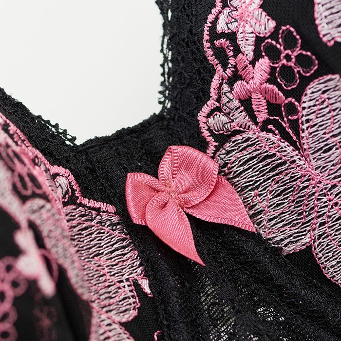 カップと前身サイドには、蝶と小花柄がキュートな印象の刺繍レースを重ねました。