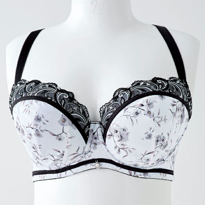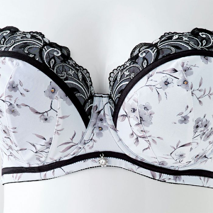 柔らかな印象のフラワープリントに、カップ上辺は艶やかな刺繍レースを重ねました。