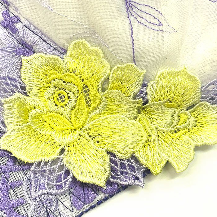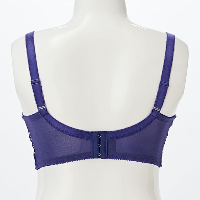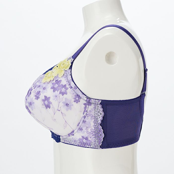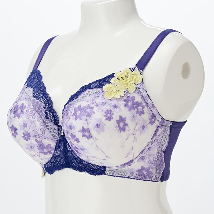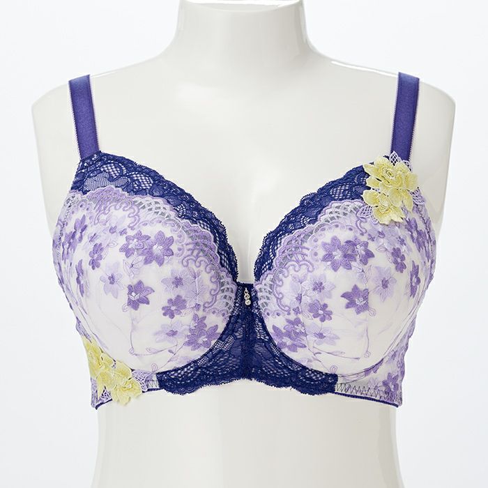 パープルでまとめた秋にぴったりなデザイン バスト全体をしっかりカバーしながら持ち上げ効果も高い、 サポート力抜群のフルカップブラ。 脇肉をスッキリさせる脇高&背中の食い込みを軽減するバックUタイプ。 カップと前身のサイドには上品なラベンダー色の刺繍レースを重ねました。 カップ上辺と前身にはディープブルーのストレッチレースをあしらい、すっきりと引き締めました。 華やかなケミカルアップリケをアシンメトリーに施し、前中心にはクリスタルモチーフを飾ったエレガントなデザインです。