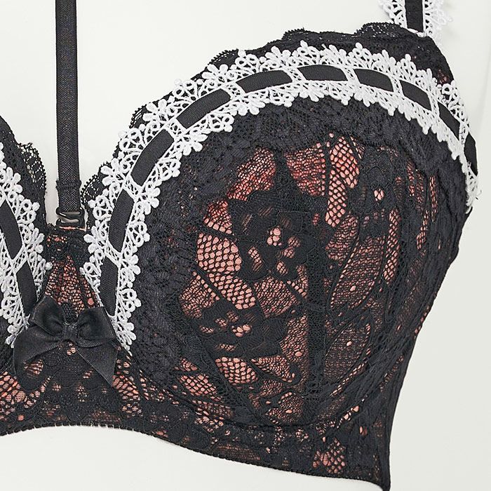 カップ上辺にはストレッチレースとリボン通しのケミカルレースを乗せ、さらにストラップにもレースをあしらったガーリーなデザインです。