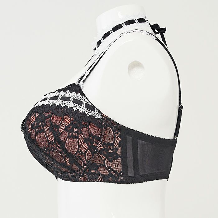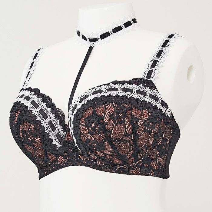 カップ上辺にはストレッチレースとリボン通しのケミカルレースを乗せ、さらにストラップにもレースをあしらったガーリーなデザインです。