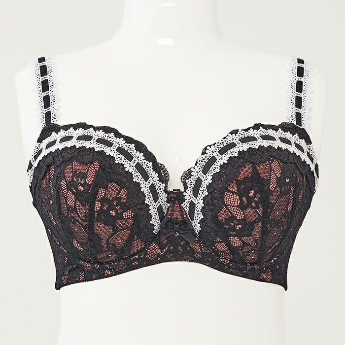 カップと前身はサーモンピンクにブラックの広幅レースを重ねました。