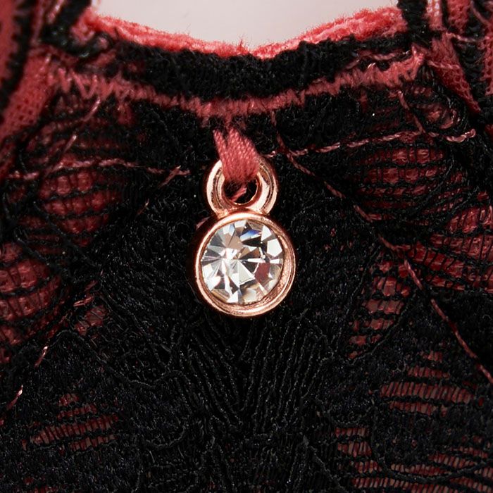 カップ上辺にはブラックのサテンリボン、前中心にはクリスタルのモチーフを飾り、特別感のあるデザインに仕上げました。
