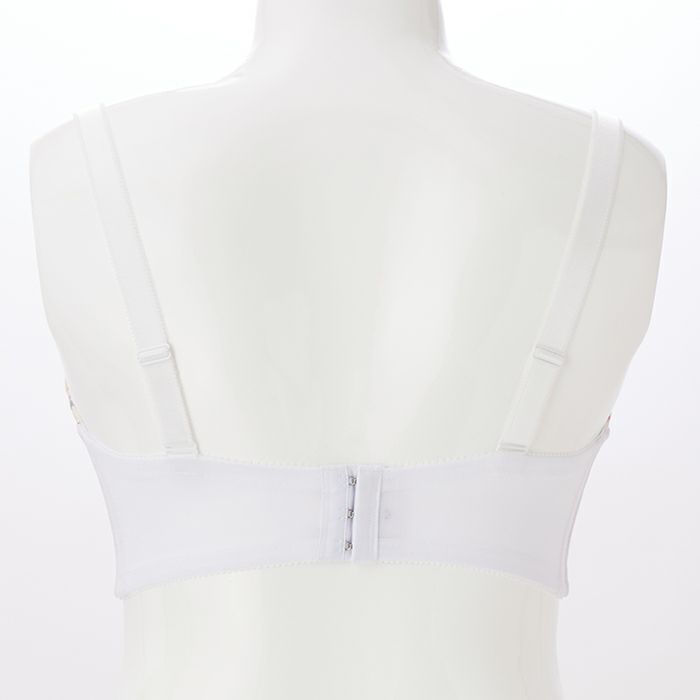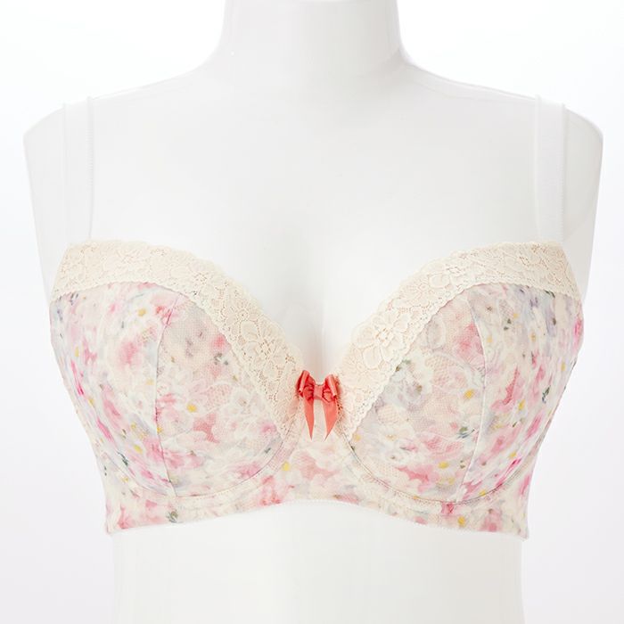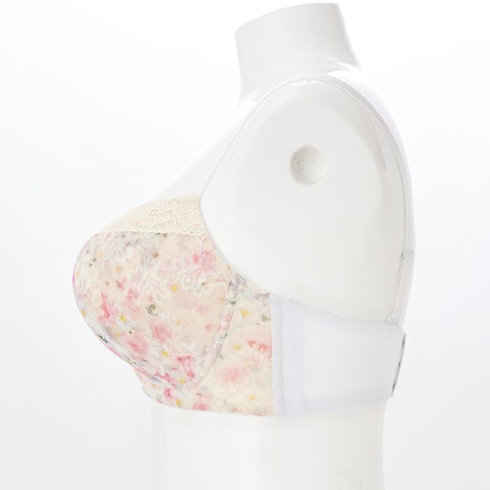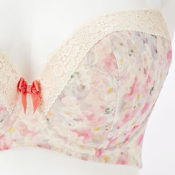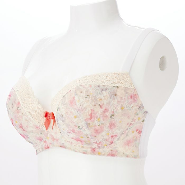 瑞々しい印象のシアープリントで爽やかに アウターに響きにくいモールドタイプ&抜群の寄せ上げ効果で、美しいシルエットを実現する「モールドブラ寄せ上げタイプ」 ホワイトベースに爽やかなカラーのプリントを組み合わせた透明感溢れるデザイン。 カップと前身はストレッチレースに花柄のチュールプリントを重ね、カップ上辺にはクリーム色の中幅レースをあしらいました。 前中心にはサーモンピンクのサテンリボンを飾りました。 ※プリント柄は、商品によって柄の見え方が違う場合がございますため、ご了承ください。