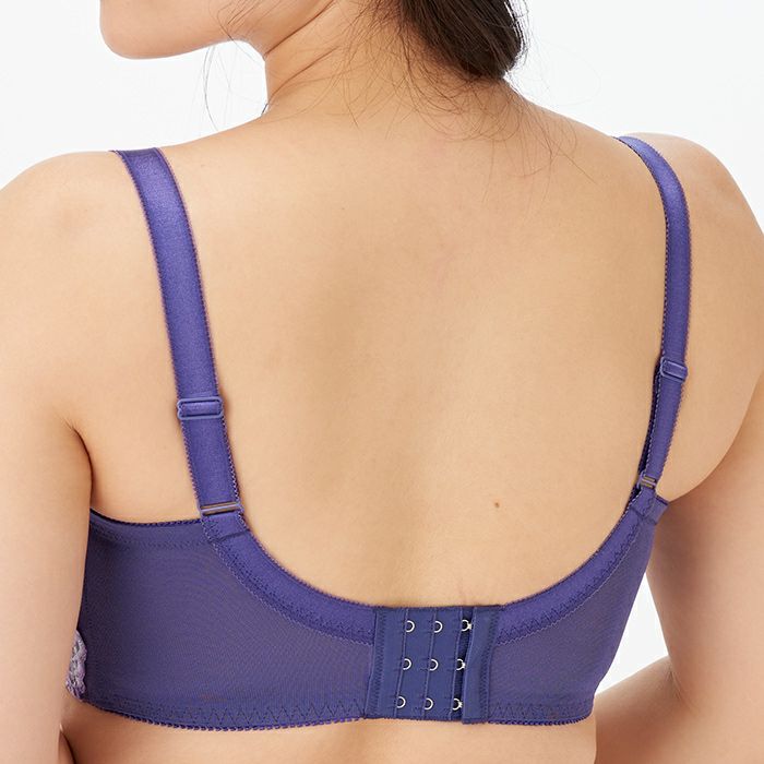 パープルでまとめた秋にぴったりなデザイン バスト全体をしっかりカバーしながら持ち上げ効果も高い、 サポート力抜群のフルカップブラ。 脇肉をスッキリさせる脇高&背中の食い込みを軽減するバックUタイプ。 カップと前身のサイドには上品なラベンダー色の刺繍レースを重ねました。 カップ上辺と前身にはディープブルーのストレッチレースをあしらい、すっきりと引き締めました。 華やかなケミカルアップリケをアシンメトリーに施し、前中心にはクリスタルモチーフを飾ったエレガントなデザインです。