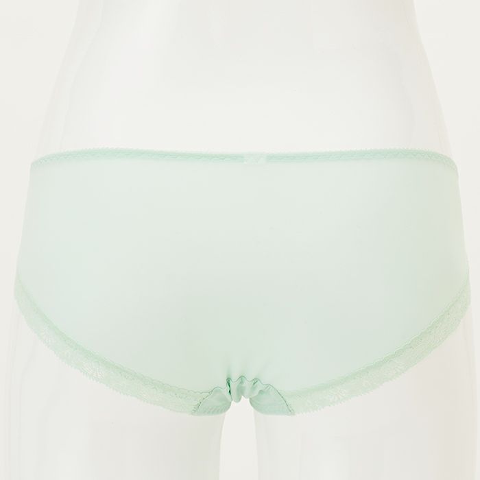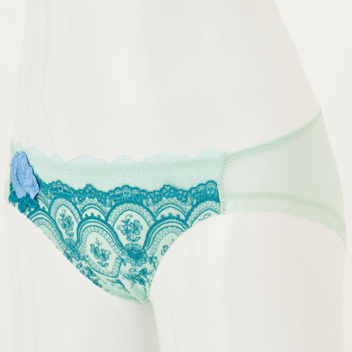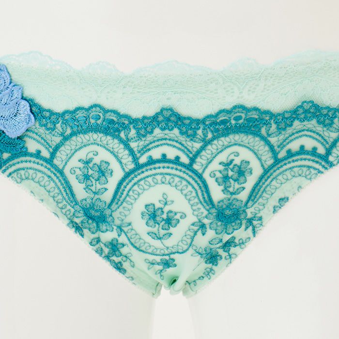 上辺にはアイスグリーンのストレッチレースを使用し、前身に乗せたレースの刺繍模様がスッキリと映えます。