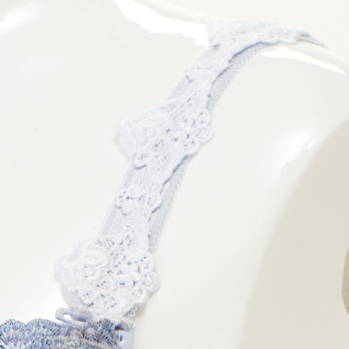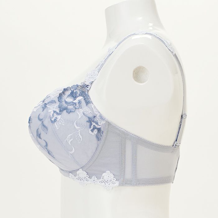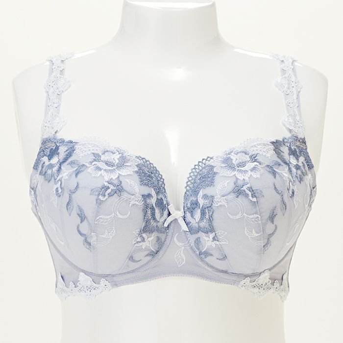 大人っぽいグレーカラーに華やかな刺繍レースを重ねた、落ち着いた雰囲気ながら軽やかさも感じさせるランジェリー。