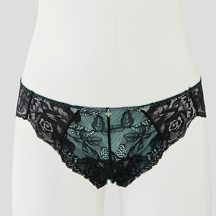 フレッシュなミントグリーンにセクシーなブラックレースを合わせたランジェリー。