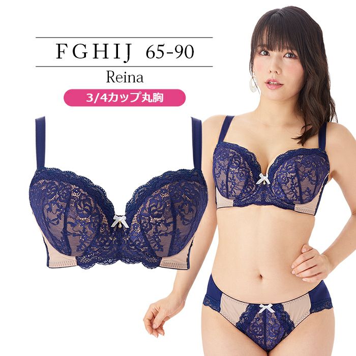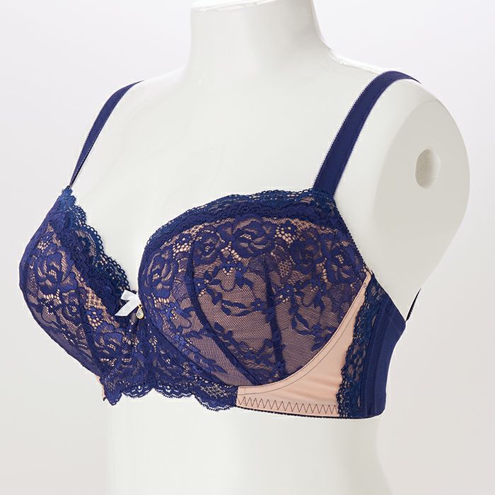ベージュカラーにネイビーのレースを合わせたクラシカルな印象のランジェリー。 カップとフロントにはストレッチレースを重ね、カップ上辺とサイドには細幅レースをあしらいました。