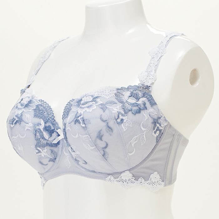 大人っぽいグレーカラーに華やかな刺繍レースを重ねた、落ち着いた雰囲気ながら軽やかさも感じさせるランジェリー。