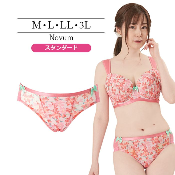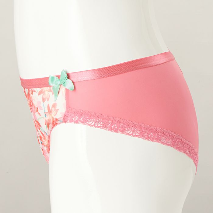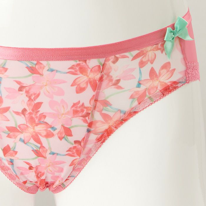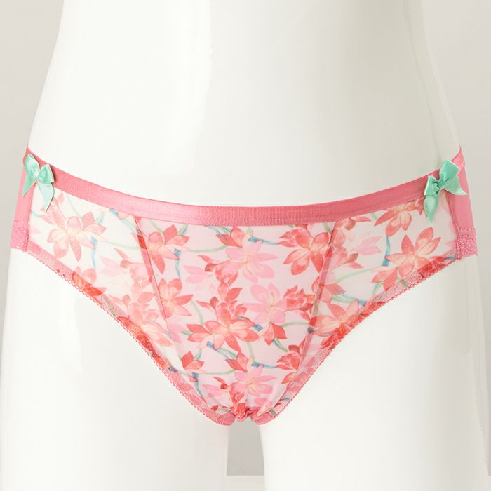 肩ラクな広幅ストラップがポイント アウターに響きにくいシームレスタイプ&バストをからだに密着させ小さく見せる「モールドブラ丸胸タイプ」とお揃いのショーツ。 ピンクと赤の花柄がフェミニンなランジェリー。 前身にはシアープリントを重ね、サイドがシースルーになった軽やかなデザイン。 ウエストに施したビビットピンクのストレッチテープが、全体をスタイリッシュな印象にまとめます。 後身は肌見せのホールをあしらってセクシーさをプラス。 両サイドにはグリーンのサテンリボンを飾りました。 アウターに響きにくいように後足口には細幅レースを使用しています。 ※プリント柄は、商品によって柄の見え方が違う場合がございますため、ご了承ください。