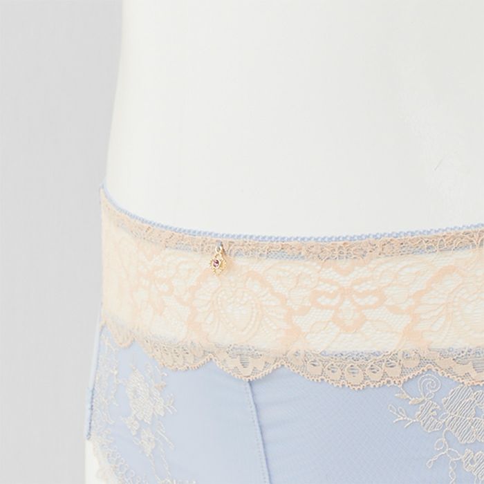 すっきりとしたアイスブルーにやわらかいエクルベージュのレースをあしらったランジェリー。
