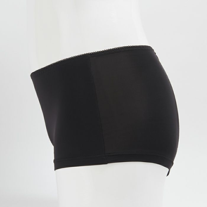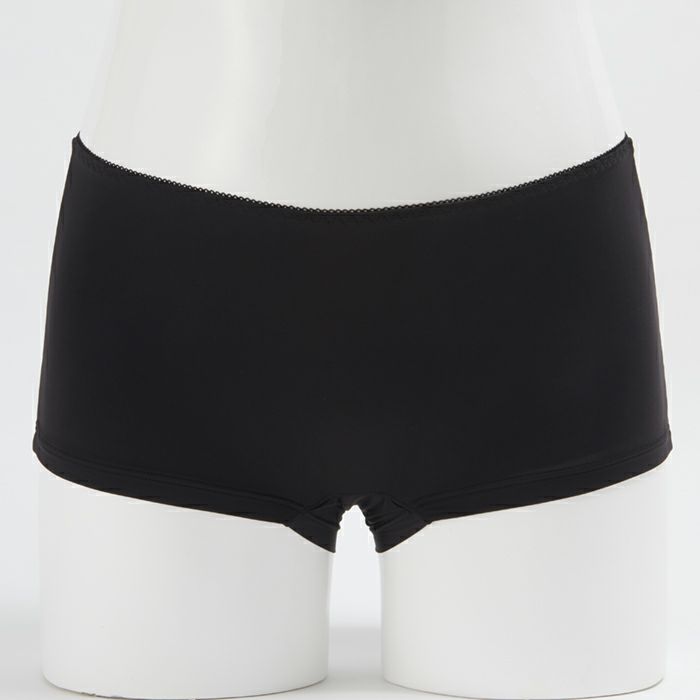 生理の不快感を軽減するサニタリーショーツ しっかりフィットして安心感抜群のサニタリーショーツ。 シンプルな無地ブラックは汚れを目立たせず、デイリーからナイト用まで活用できます。 バックまで防水布でカバーして、ロングナプキンにも対応。モレをしっかり防ぎます。 マチ部分はナプキンの羽根をしまえる設計。後身の立体ギャザーでヒップを包みこみ、ズレずにぴったりフィットします。 伸縮性が高くゴワつかない素材で、不快なムレを軽減します。 ボーイズレングスタイプなので締め付けが少なく、脚の付け根の痛みや痒みも解消します。 足口は肌当たりが優しい折り返し仕様です。
