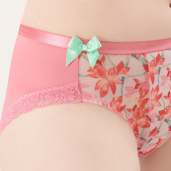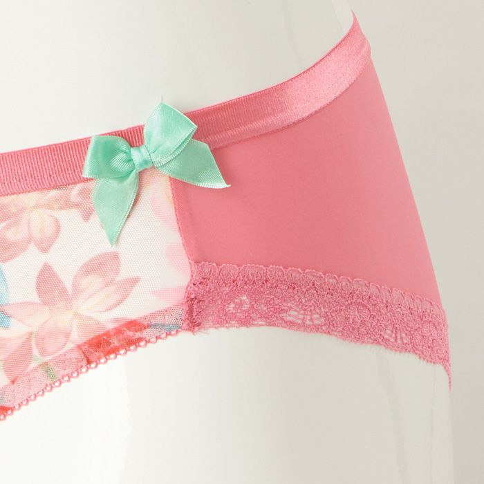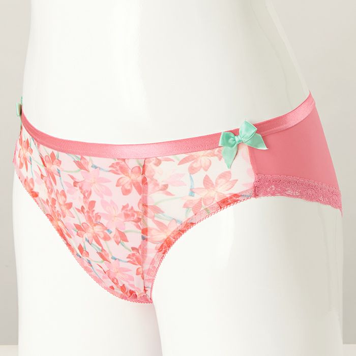 肩ラクな広幅ストラップがポイント アウターに響きにくいシームレスタイプ&バストをからだに密着させ小さく見せる「モールドブラ丸胸タイプ」とお揃いのショーツ。 ピンクと赤の花柄がフェミニンなランジェリー。 前身にはシアープリントを重ね、サイドがシースルーになった軽やかなデザイン。 ウエストに施したビビットピンクのストレッチテープが、全体をスタイリッシュな印象にまとめます。 後身は肌見せのホールをあしらってセクシーさをプラス。 両サイドにはグリーンのサテンリボンを飾りました。 アウターに響きにくいように後足口には細幅レースを使用しています。 ※プリント柄は、商品によって柄の見え方が違う場合がございますため、ご了承ください。