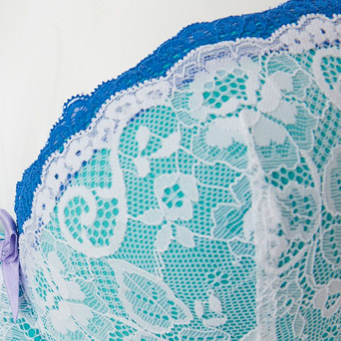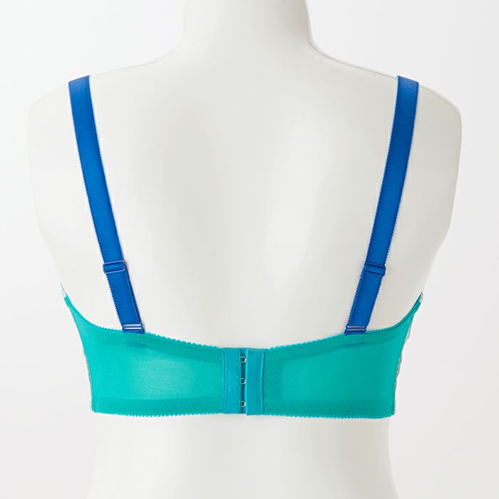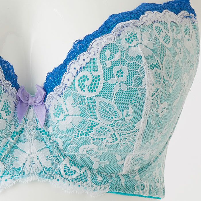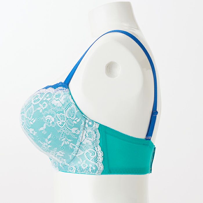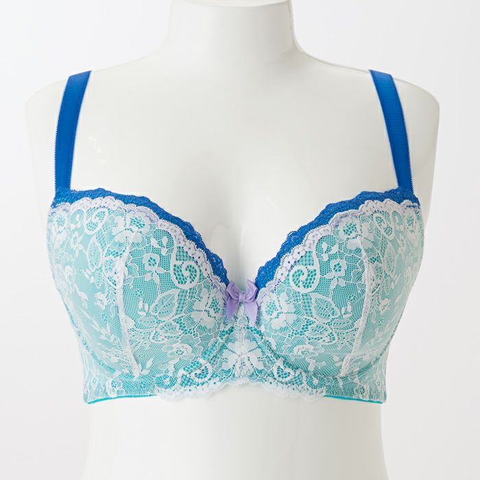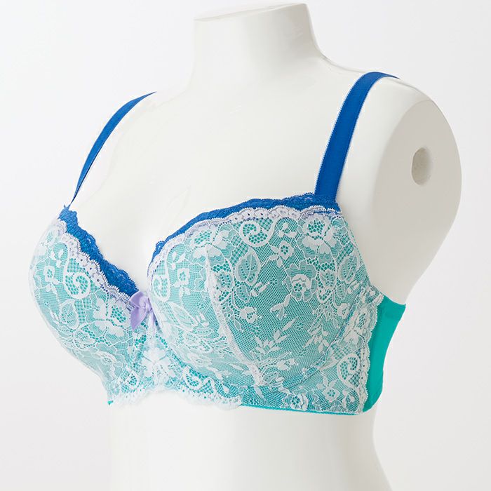 フレッシュな印象のブルーグリーンカラー アウターに響きにくいモールドタイプ&抜群の寄せ上げ効果で、美しいシルエットを実現する「モールドブラ寄せ上げタイプ」 清涼感のある色づかいが爽やかな印象のランジェリー。 ブルーグリーンをベースカラーに、カップと前身にはホワイトのストレッチレースを重ねた総レースデザイン。 カップ上辺の細幅レースとストラップは、挿し色のブルーで鮮やかさをプラスしました。 前中心にはパープルのサテンリボンを飾りました。