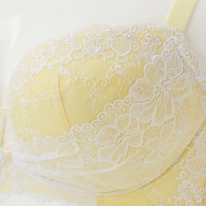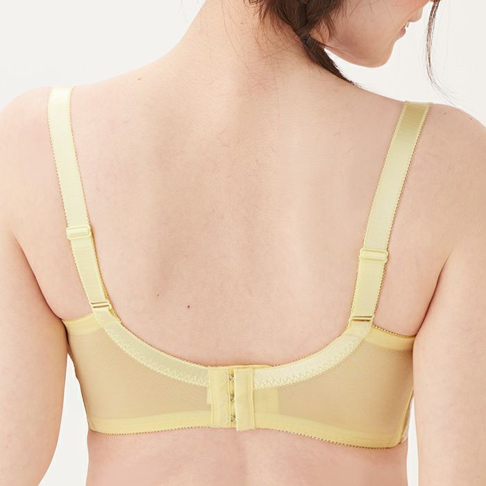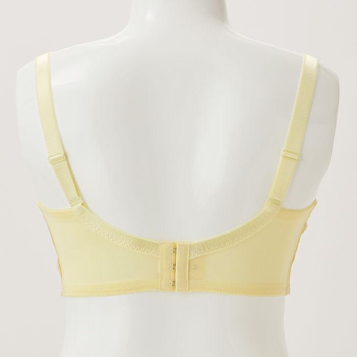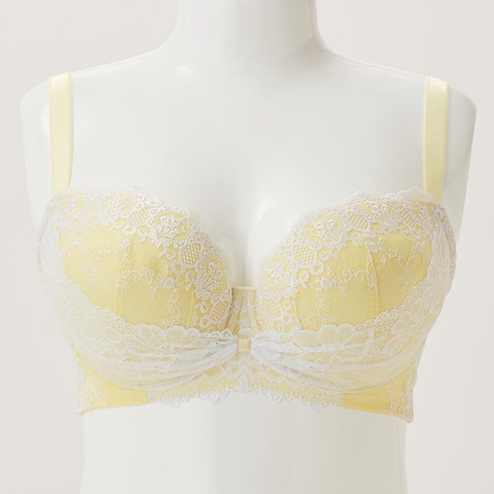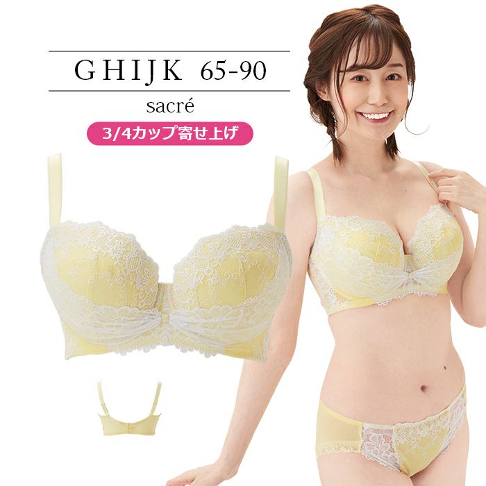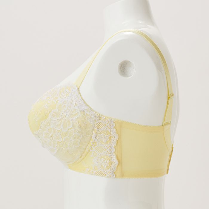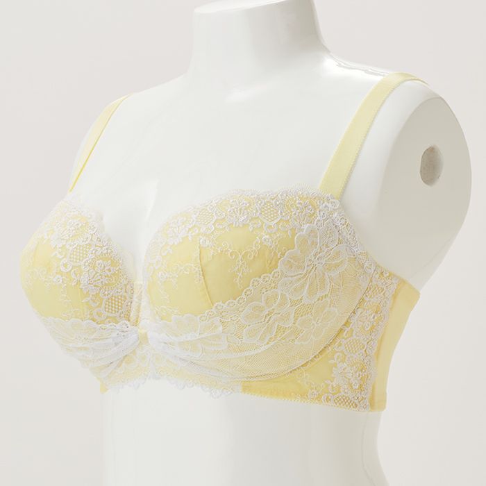 やわらかな色合いでやさしく包み込んで 大きいバストをしっかりと支え、バストを寄せて上げて脇もスッキリ、 サポート力の強い人気の「寄せ上げタイプ」のブラ。 脇肉をスッキリさせる脇高&背中の食い込みを軽減するバックUタイプ。 クリーム色とホワイトの組み合わせが清楚で、普段使いしやすいカラーのランジェリー。 カップと前身のサイドには可憐な印象の刺繍レースをあしらいました。 ホワイトのストレッチレースを前中心に重ね、リボンのようなギャザーデザインでカップを覆いキュートに仕上げました。 ※「お試しブラVer2.5N 3/4カップ寄せ上げ(SP-493)※2022年4月中旬発売予定 」と同じカップの型となります。