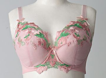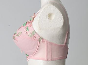 全体をピンクで統一し、カップと前身アンダーには光沢のあるピンクのお花ととグリーンの葉っぱの刺繍を贅沢に施しました。