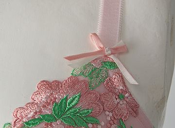 ストラップの付け根と前中心にはピンクと白の2色のサテンリボンを使用。
