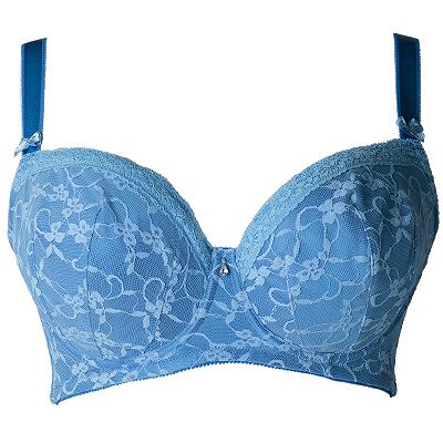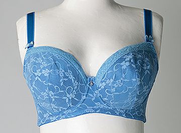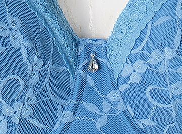 カップとアンダーには淡い水色の花柄ストレッチレースを施し、カップ上辺にはレースと同色の細幅レースを乗せ両側ストラップにはサテンリボンを飾りました。