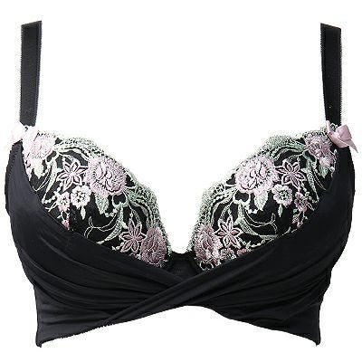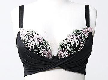 カップレースはピンクの濃淡の大小さまざまな花をスプリンググリーンが周りを囲み春らしい配色のエンブレースの上に黒色のストレッチ素材で大きいサイズにはなかなかない人気のカシュクールデザインを施しました。