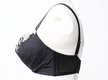 下カップ裏に取り外しパットが付いてパッドポケットがついています。今までの商品と比較しカップ素材の伸びは無いですが、しっかりグラマーサイズの胸をサポートします。左右の大きさの違う方、デコルテにボリュームを出したい時など、シーンによってご自身でパットを活用下さい。
