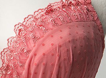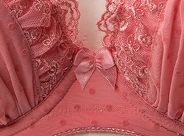 全体をピンクローズで統一し、カップ部のレースは小さな水玉模様のフロッキーレースでギャザーを施し、その上辺は細巾の刺繍レースにギャザーを入れフリル調になっています。