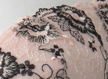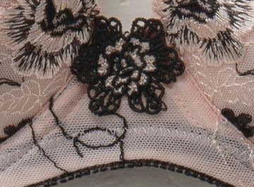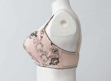 カップとアンダーには薔薇と繊細な蔦の刺繍が美しいエンブレースを使用し、柔らかな色使いと相まって上質な女性らしさを表現しています。