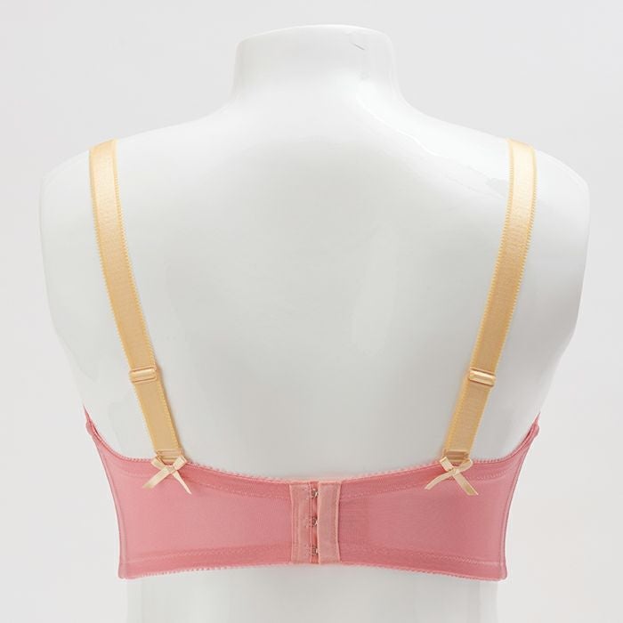 カップ上辺と前中心には繊細なサテンリボンを飾りました。さらに後ろストラップにもサテンリボンを飾り、バックスタイルも可愛く仕上げました。