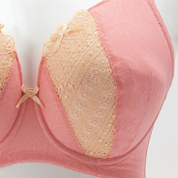 カップは幾何柄のケミカルレースで切り替え、スイートなデザインに大人っぽさと高級感をプラス。