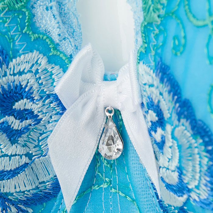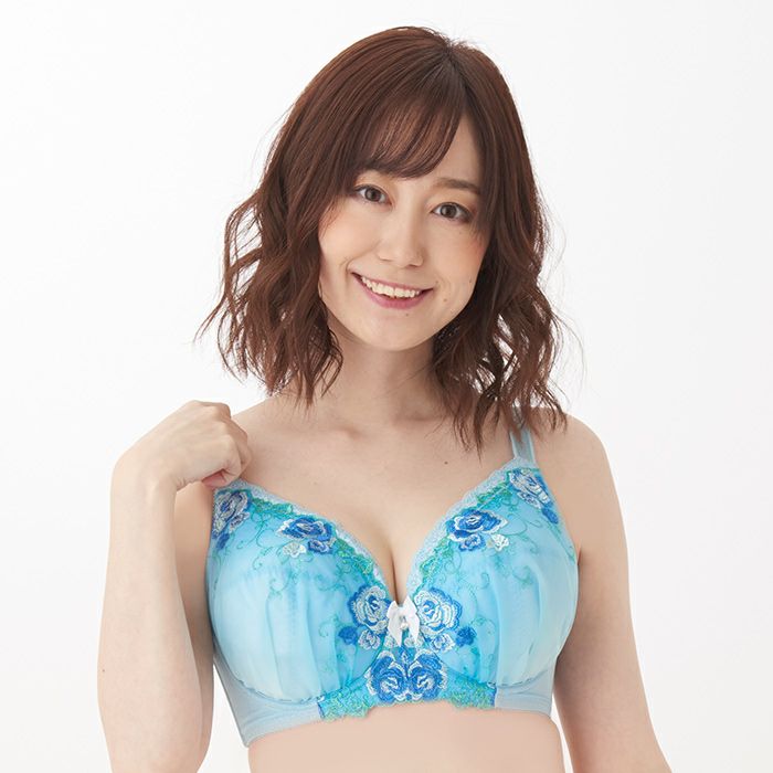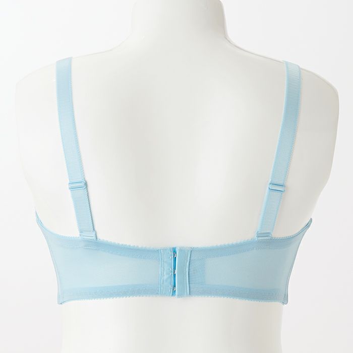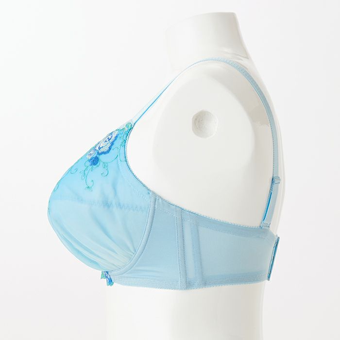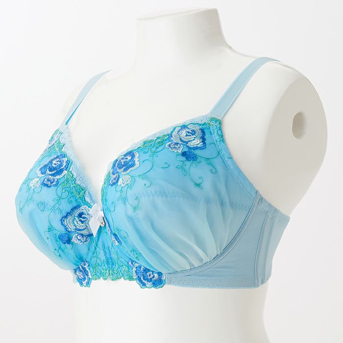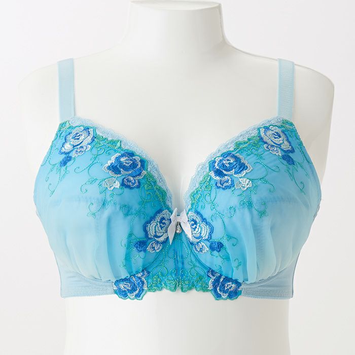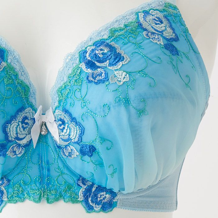 カップに重ねたエンブレースは、水色からホワイトのグラデーションが爽やかな印象のオーガンジー素材に、華やかなブルーの花柄刺繍が映えます。