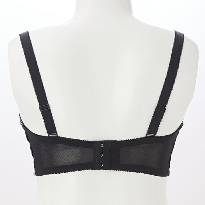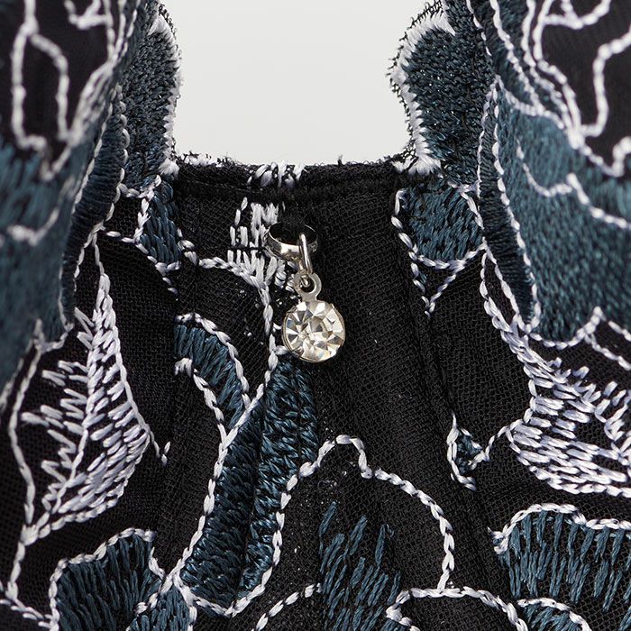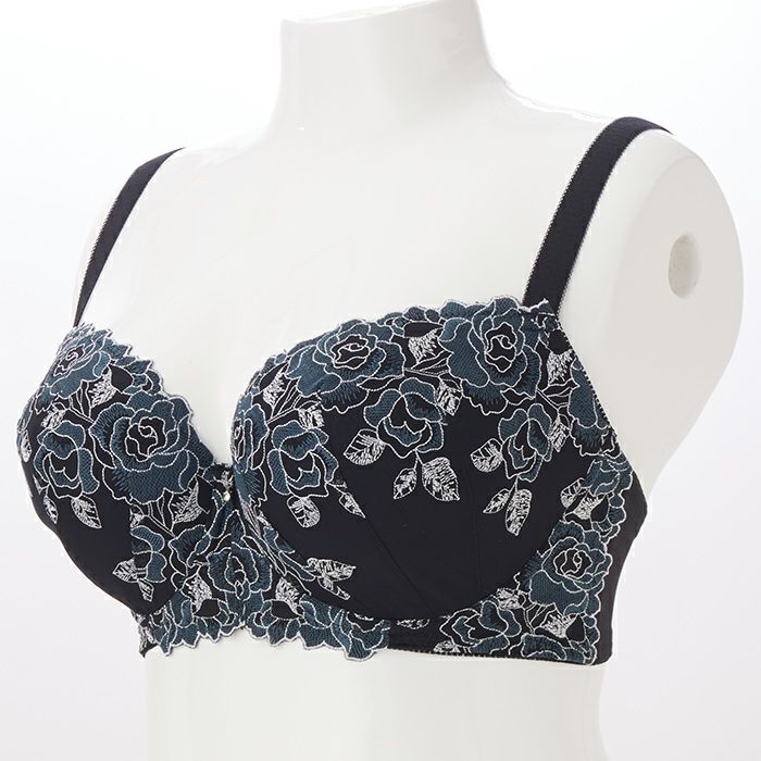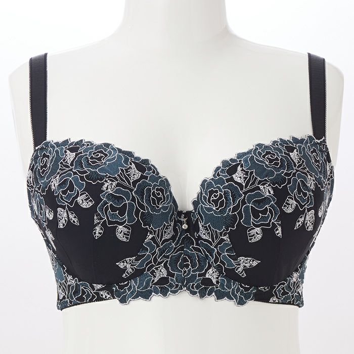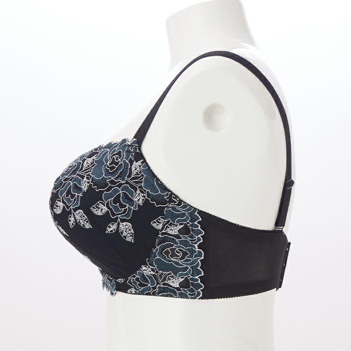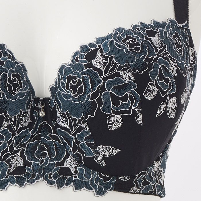 カップと前身には、ホワイトとダスキーグレーの刺繍糸を使用したレースを重ね、光の加減によってブルーやグリーンっぽく見える美しい薔薇柄をあしらいました。