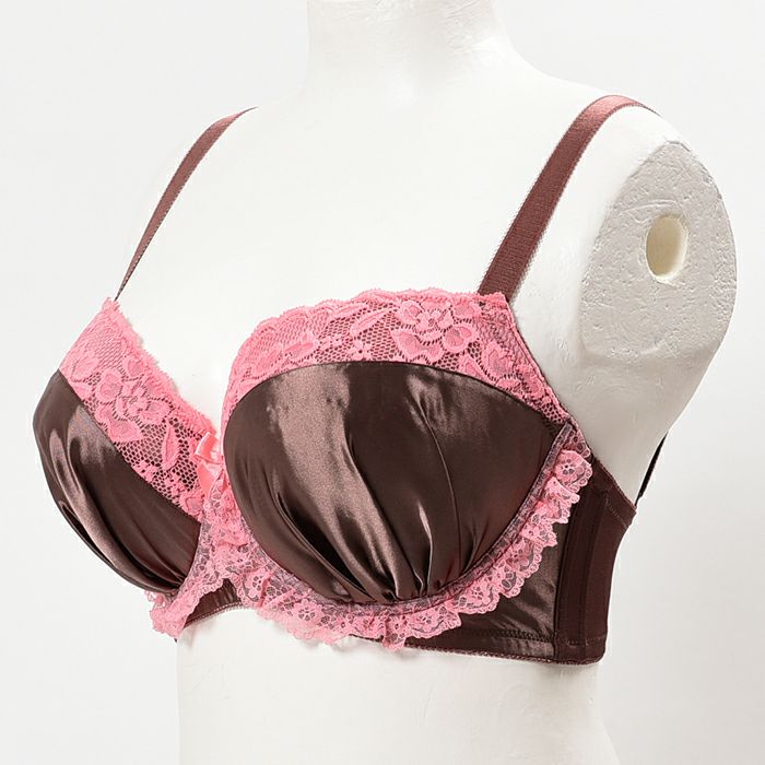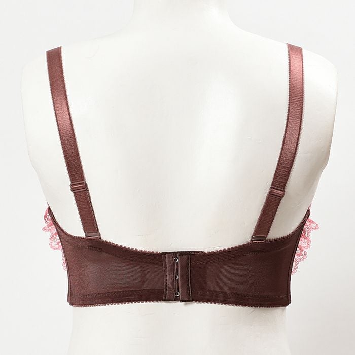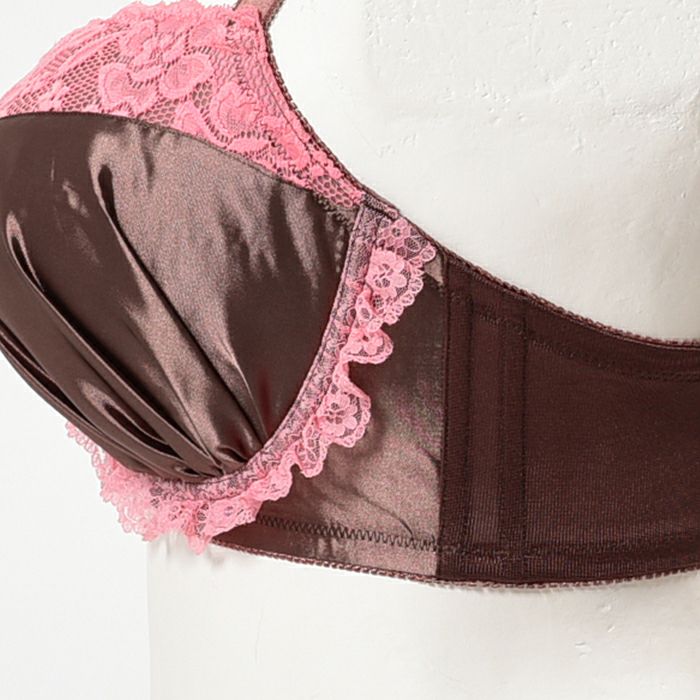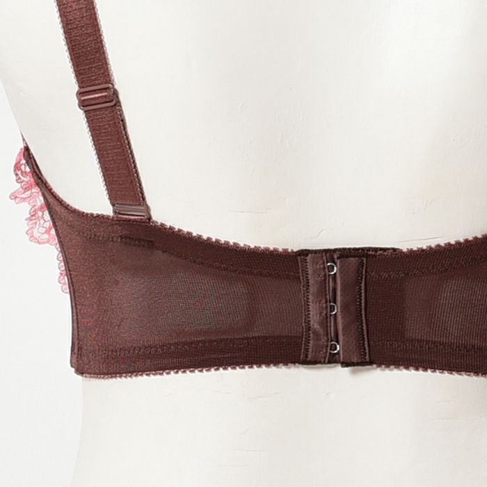 チョコレートブラウンとストロベリーピンクの組み合わせがガーリーな3/4カップブラ。