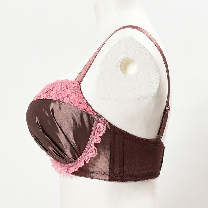 ギャザーを寄せてふんわりしたカップはサテン素材を使用し、大人っぽいブラウンカラーと併せて甘さの中にもビターな雰囲気を漂わせます。