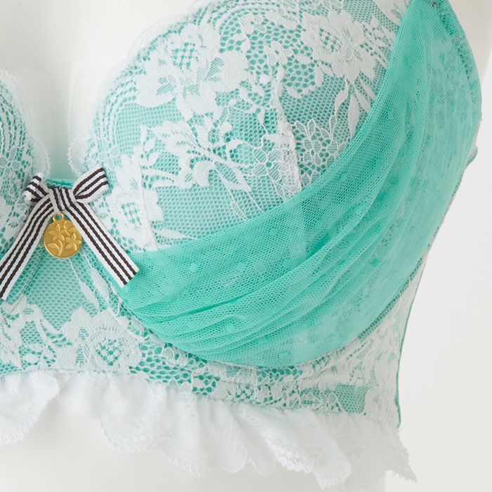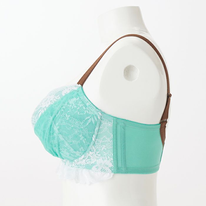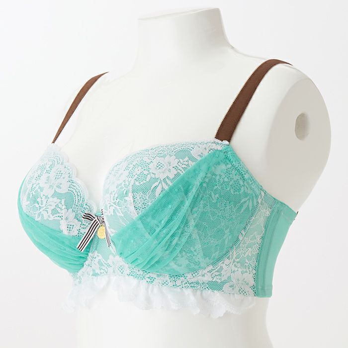 チョコミントをイメージした爽やかなデザイン 大きいバストをしっかりと支え、バストを寄せて上げて脇もスッキリ、 サポート力の強い人気の「寄せ上げタイプ」のブラ。 脇肉をスッキリさせる脇高&背中の食い込みを軽減するバックUタイプ。 ミントグリーンにブラウンを差し色にした、チョコミントのようにフレッシュなカラーリング。 カップにはホワイトのストレッチレースを重ね、サイドリフトにドット柄のチュール素材を施しました。 前身アンダーにあしらったフリルは、ソフトな手触りのレースを使用しています。 前中心にはストライプ柄のリボンとコイン型のモチーフを飾り、カジュアル感をプラスしました。