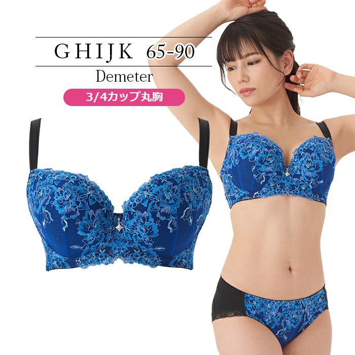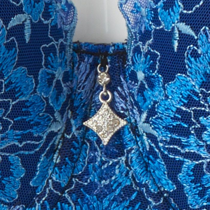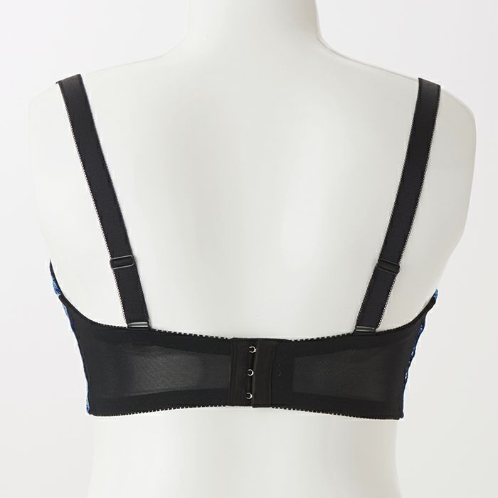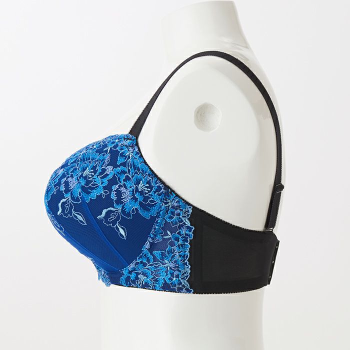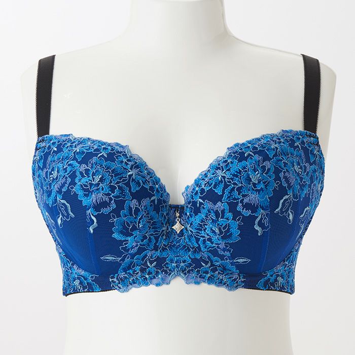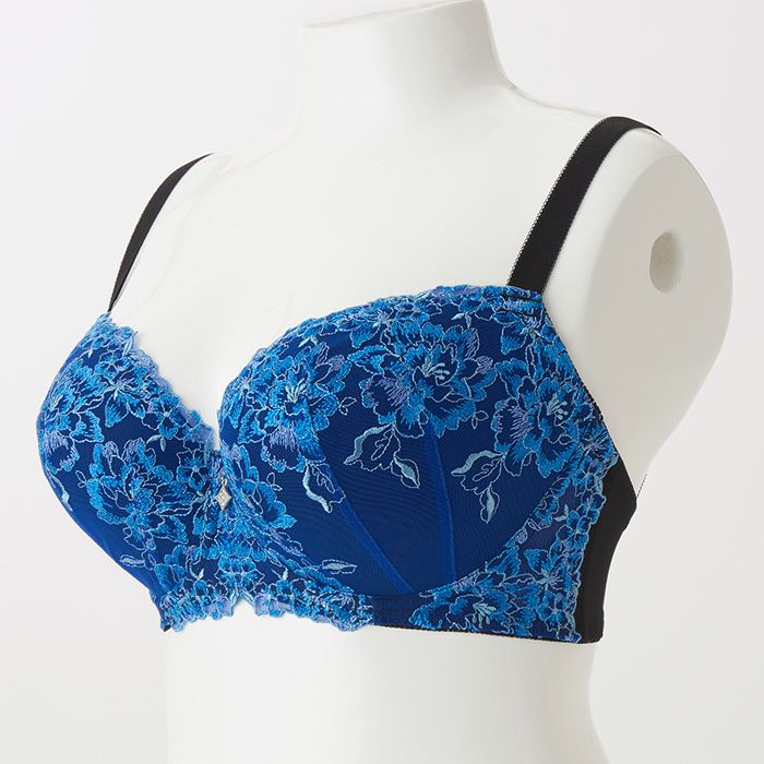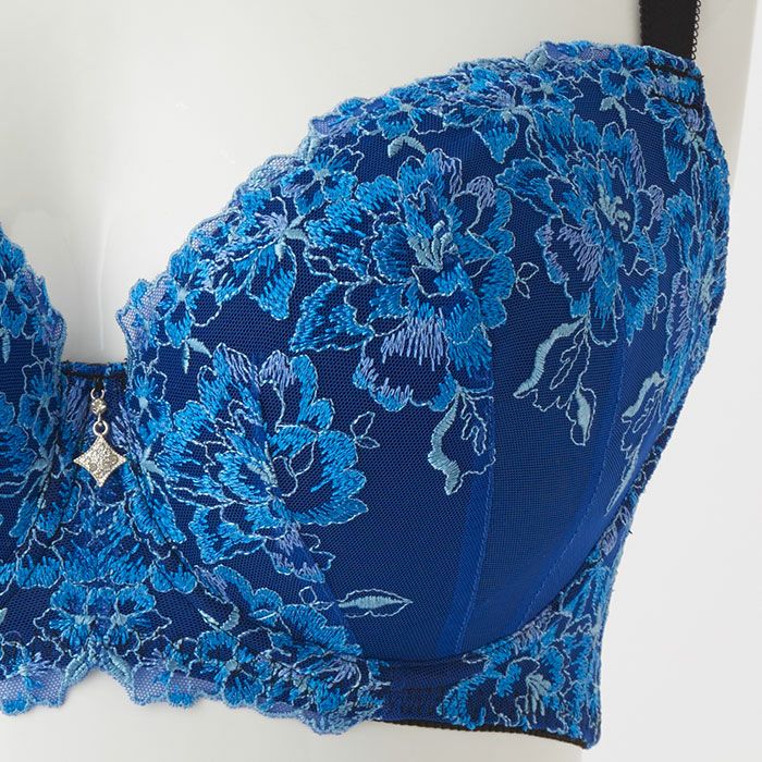 ブルーの色彩が幻想的な刺繍レース バストの存在感を目立たせず、自然な丸みを表現する 「丸胸タイプ」のブラ。 鮮やかなブルーとダークなブラックの組み合わせが幻想的な雰囲気のランジェリー。 カップと前身には、ブルーのトーンオントーンカラーが華やかなエンブレースを重ねました。 前中心にはダイヤ型のシルバーモチーフを飾り、エレガントなデザインに仕上げました。