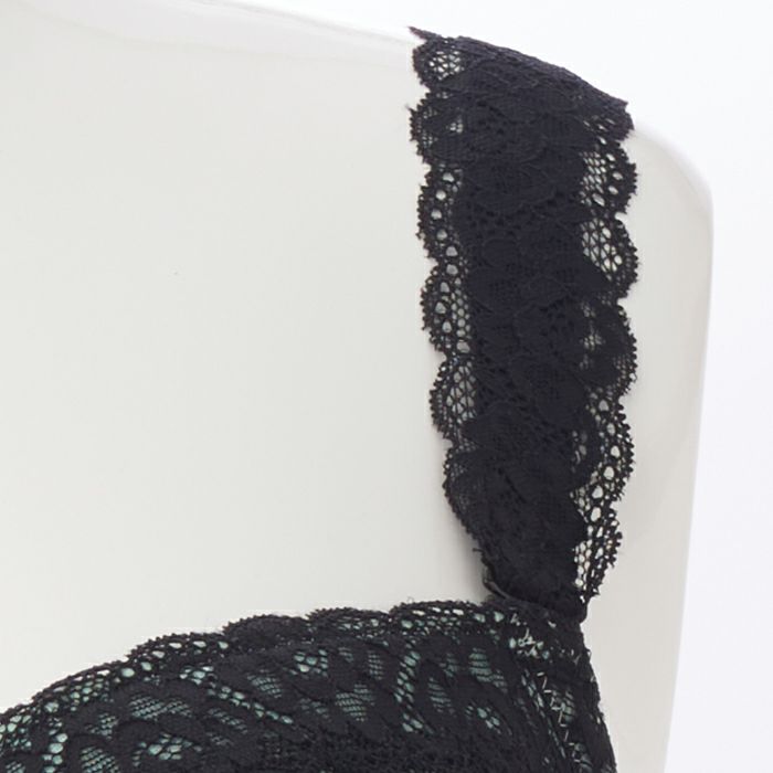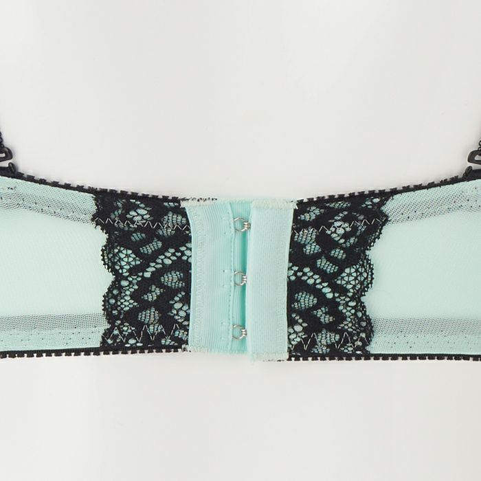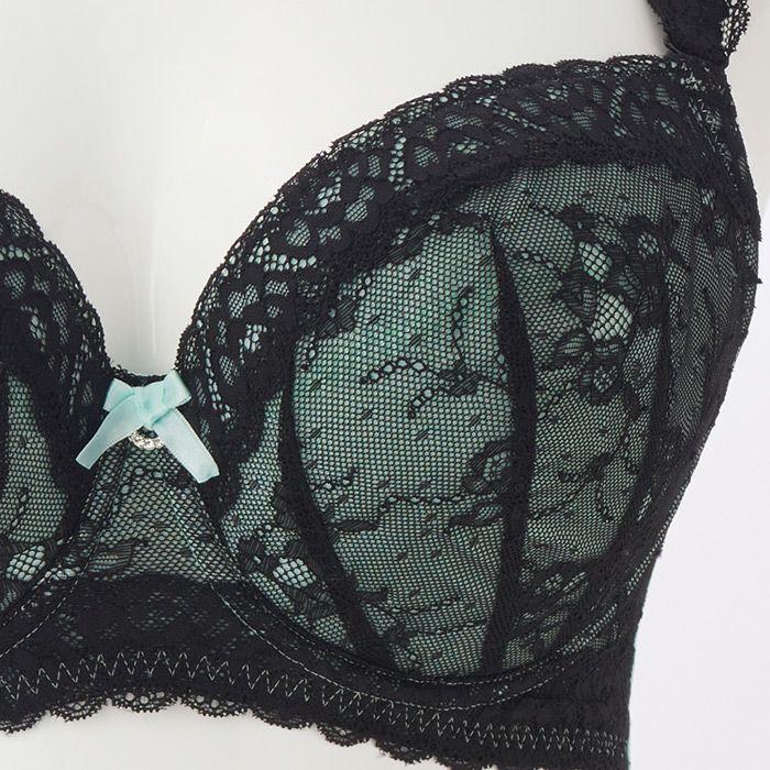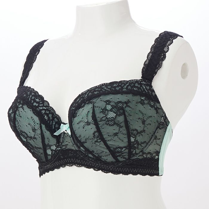 フレッシュな印象のアイスグリーンにブラックのレースを合わせたセクシーなランジェリー。