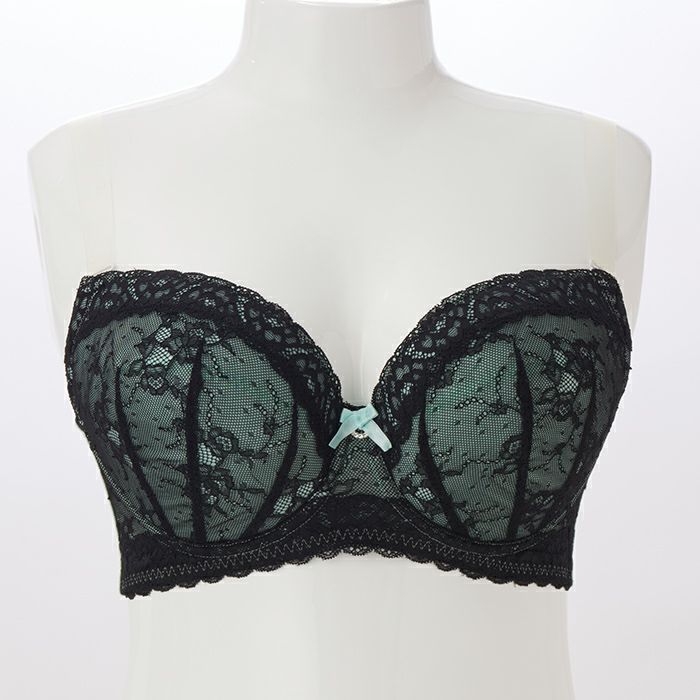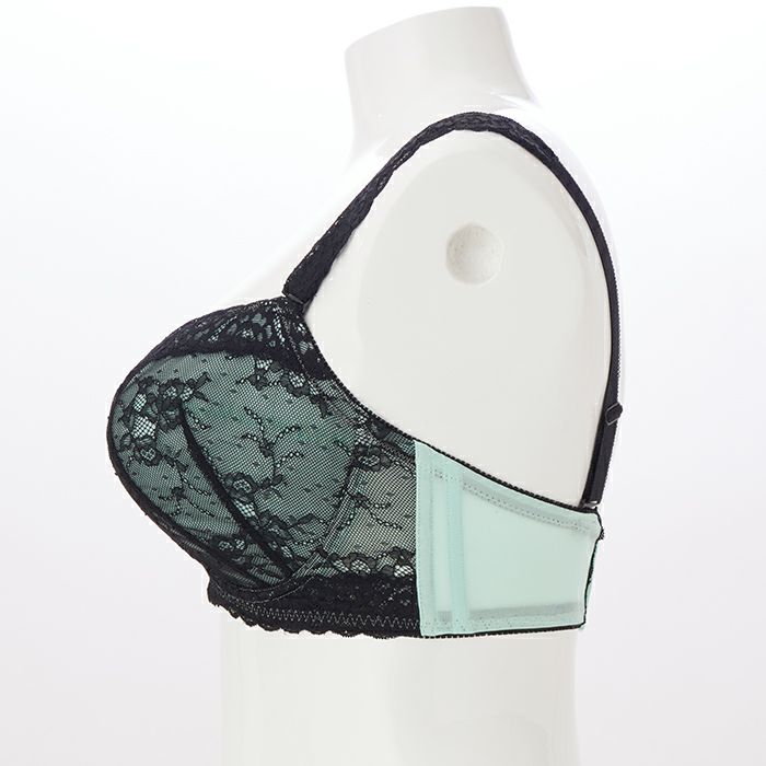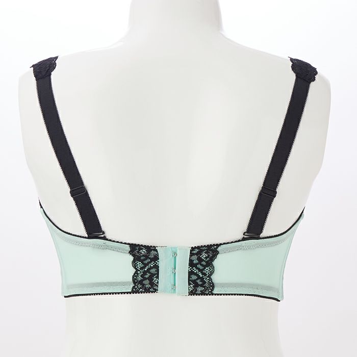 レースのストラップはブラックでまとめ、洋服から見えても下着っぽく感じないデザイン。ストラップは別売りの透明ストラップと付け替え可能です。