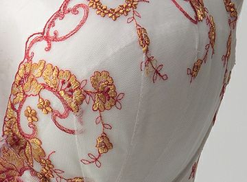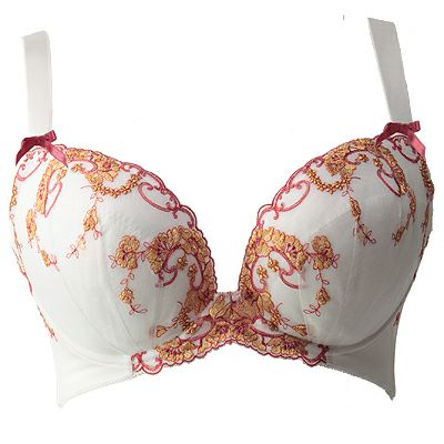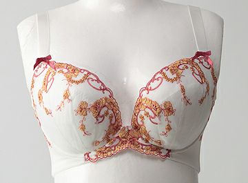 全体を白色で統一しカップと前身アンダーにコード調の様なエンブレースを上から下に向け施し、ベースの白にとっても映えます。