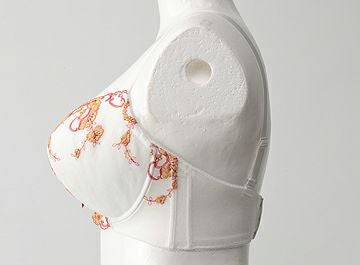 下カップ裏に取り外しパットが付いてパッドポケットがついています。今までの商品と比較しカップ素材の伸びは無いですが、しっかりグラマーサイズの胸をサポートします。左右の大きさの違う方、デコルテにボリュームを出したい時など、シーンによってご自身でパットを活用下さい。