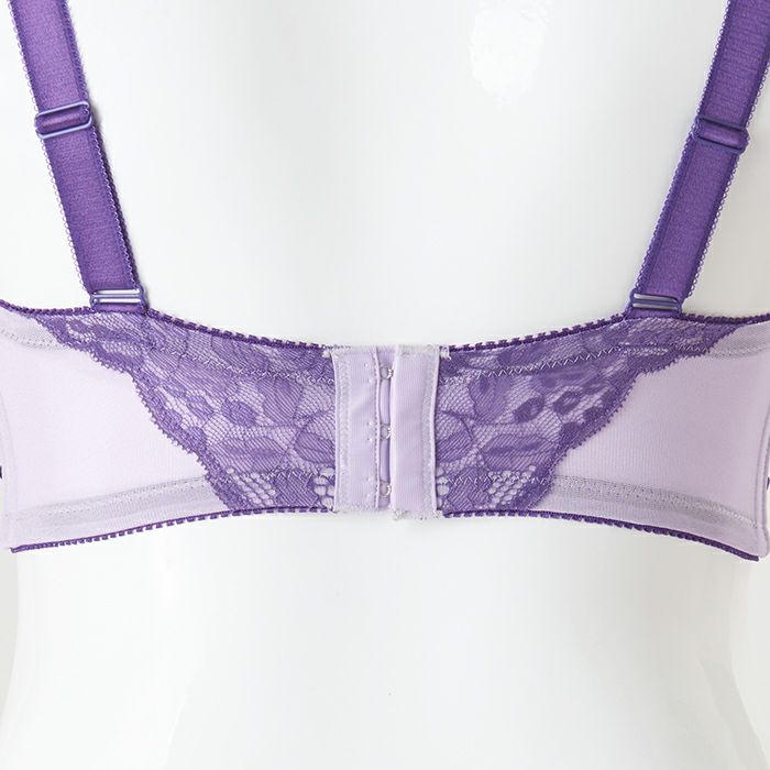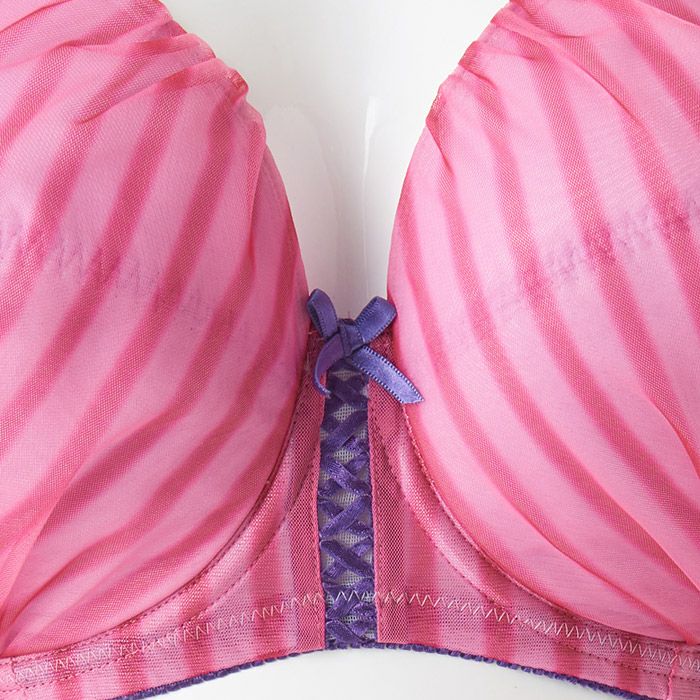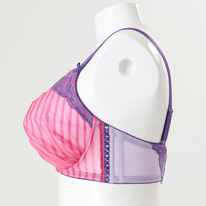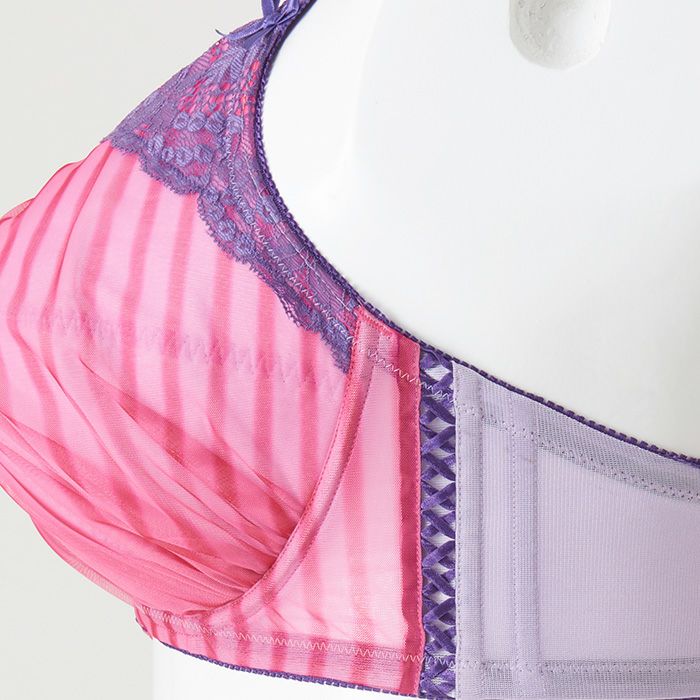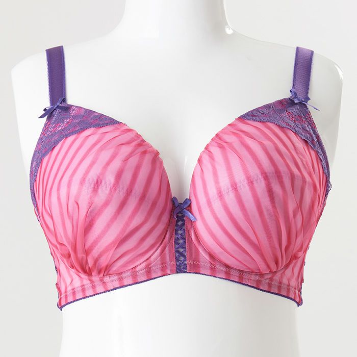 気分高まるビビットカラー×ストライププリント バスト全体をしっかりカバーしながら持ち上げ効果も高い、 サポート力抜群のフルカップブラ。 気分のあがるビビットピンクのストライプが印象的なランジェリー。 カップ部のチュールは上下ギャザーをほどこし、派手やかな雰囲気の中にもエアリー感を表現しました。 前中心とサイドのレースアップリボンがセクシー感を高めます。 カップ上部にはストレッチレースを重ね、前中心とストラップにはサテンリボンを飾った、ディテールにこだわったデザインです。 バックスタイルはラベンダーをベースに、バイオレットのストレッチレースをほどこし、フロントとはまた少し違った表情を楽しめます。