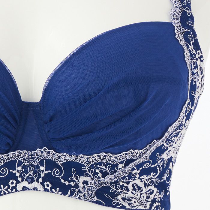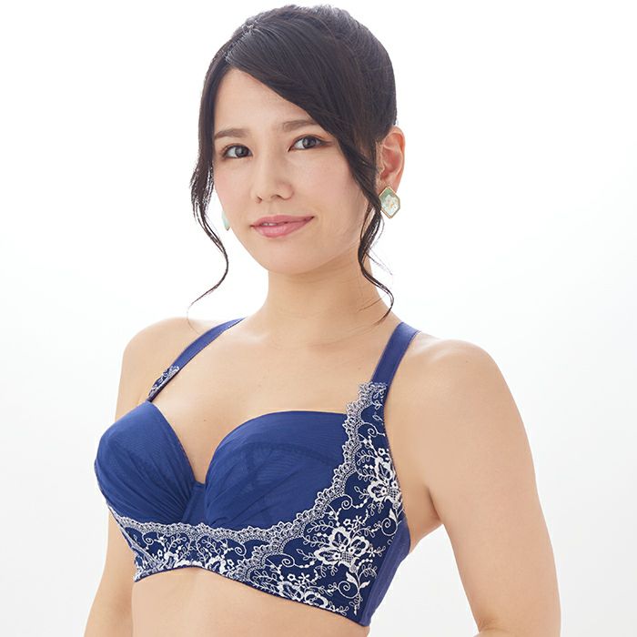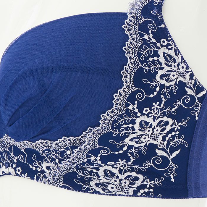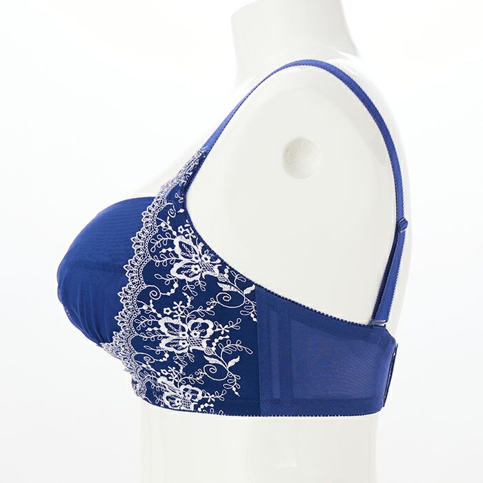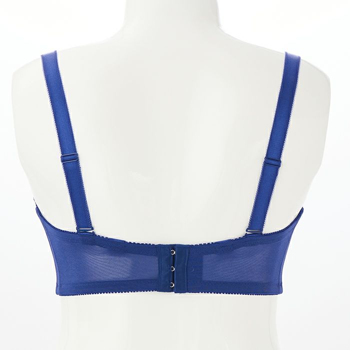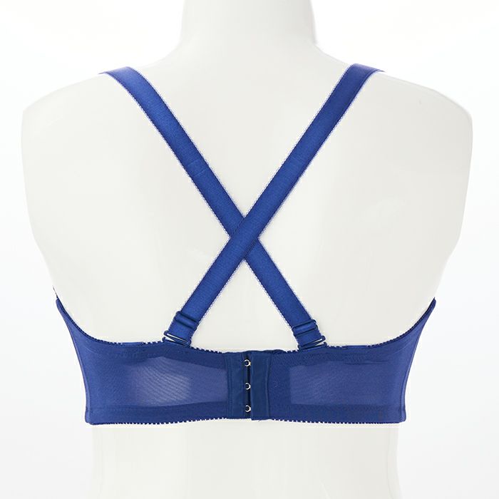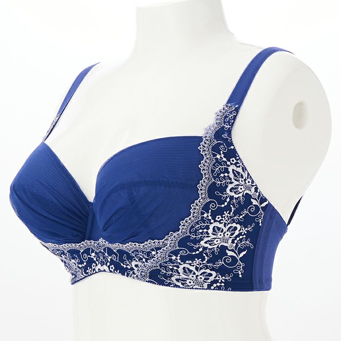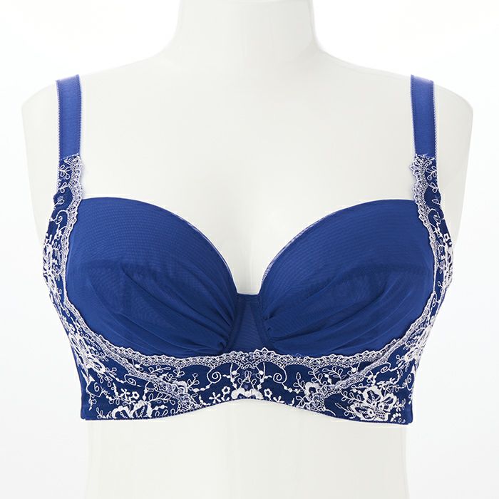 深いブルーに映える刺繍が高貴さを漂わせる 大きいバストをしっかりと支え、バストを寄せて上げて脇もスッキリ、 サポート力の強い人気の「寄せ上げタイプ」のブラ。 高貴なイメージのロイヤルブルーに、線画を想わせるホワイトの刺繍が映えるランジェリー。 カップにはソフトチュールを重ね、優雅なドレープをあしらいました。 カップ下とサイドリフトに刺繍レースを施し、バスト周りをスッキリさせプッシュアップ効果も期待できます。 お好みで後ろストラップを移動可能です。 ・ストラップを内側へ移動させると、肩からずり落ちにくくなります。 ・ストラップをクロスさせると姿勢が良くなりスタイルアップに。