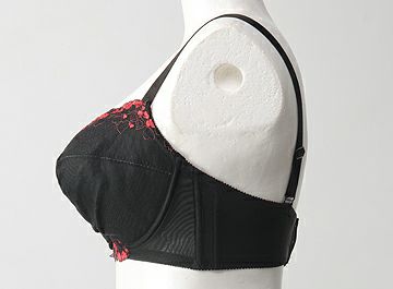 全体を黒で統一し、カップ上辺と前身アンダーには赤いハートの刺繍とコード調の茶色いハートが散りばめられています。