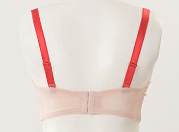 カップとアンダーにはストレッチレースを重ね、全体をフェミニンな淡いピンクで統一。バラとストラップの赤が映えるエレガントなデザインに仕上げました。