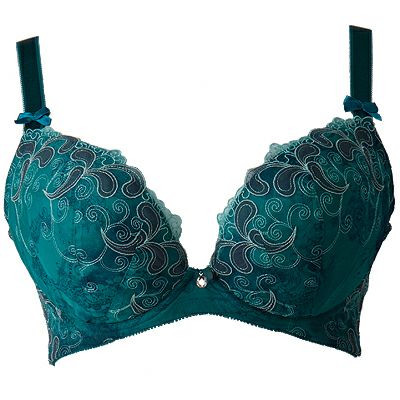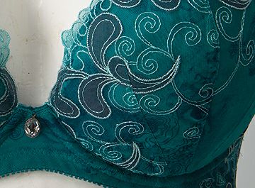 画像ではエメラルドグリーンみたいでしたが、実際はスゴく濃い綺麗なエメラルドグリーンでした。着用時は尖ったバストになり、やや大袈裟おっぱいになります。付け心地はバストは綺麗に包み込んだ状態で収まります。後、このブラのタイプは私は大好きです