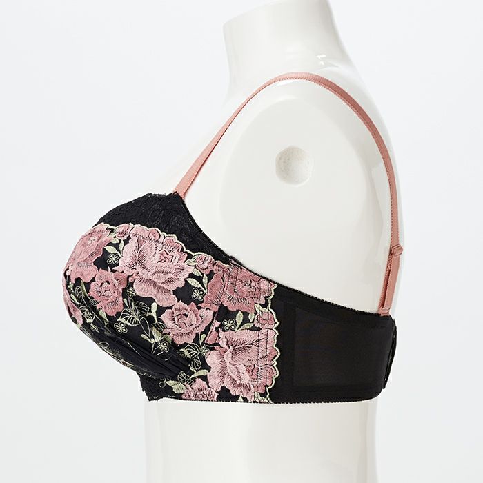 カップと前身のサイドには美しい薔薇の刺繍レースを重ね、カップ上辺と前身にはブラックのストレッチレースを組み合わせました。