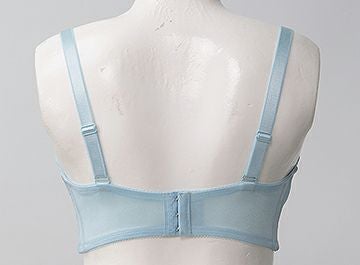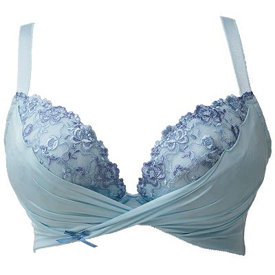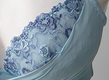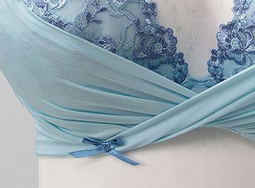 大人で上品な水の精をイメージし、カップ上辺は2色のエンブレースを使い、その上には淡い水色のストレッチ素材で人気のカシュクールデザインです。
